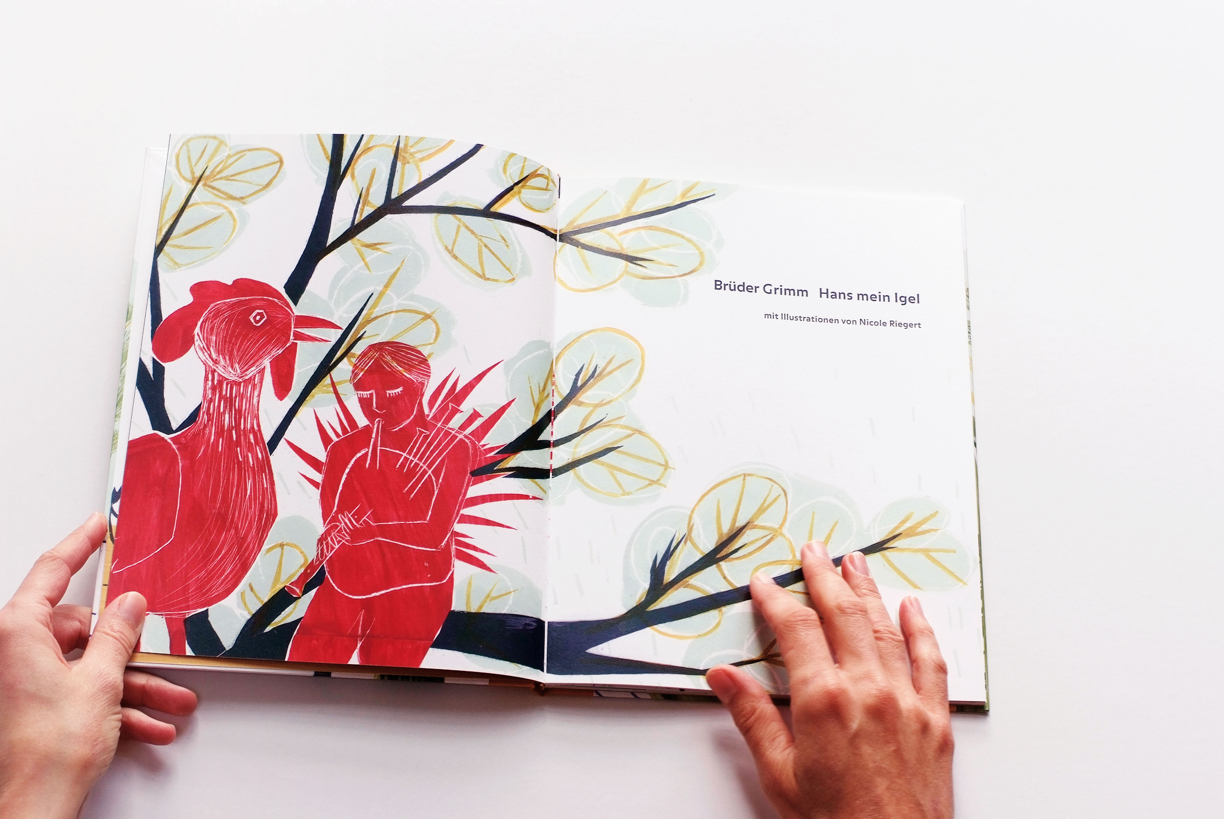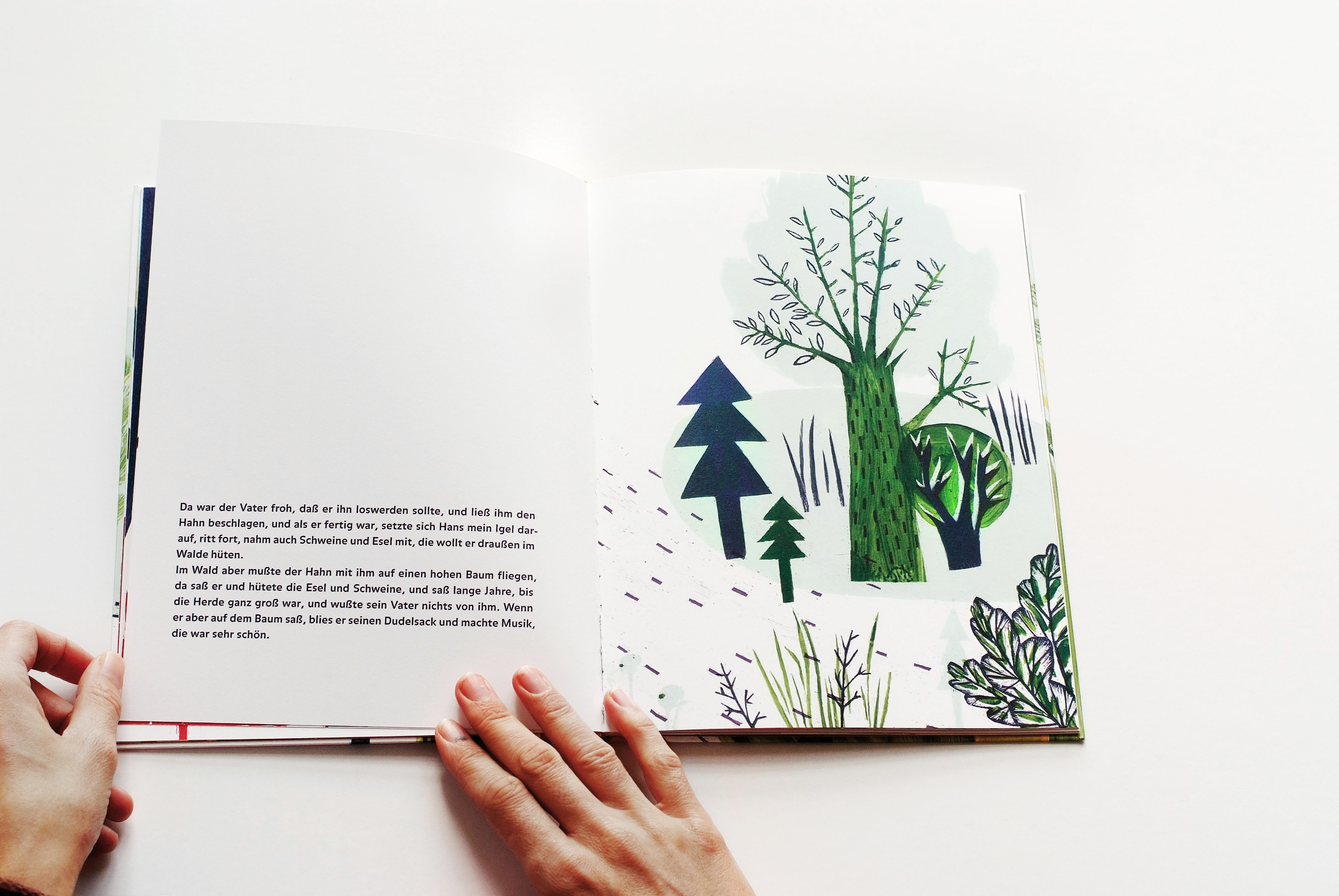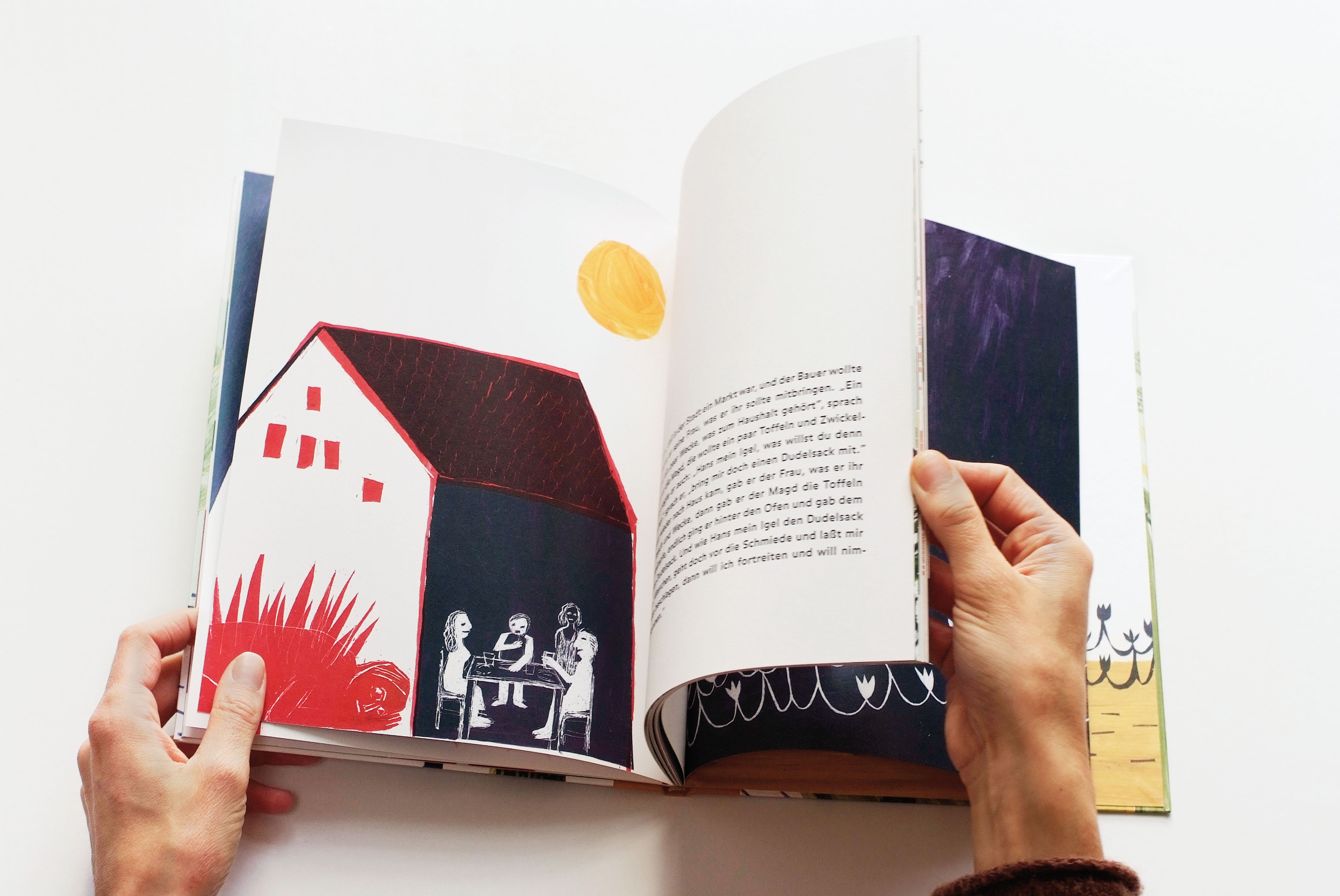 Das Grimmsche Märchen erzählt von einem Kind, das halb als Igel und halb als Mensch zur Welt kommt und wegen seiner Andersartigkeit verstoßen wird. Erst durch die Zuneigung einer Prinzessin wird der Fluch gelöst, und Hans kann seine Igelhaut abstreifen. In Schabtechnik wurden kräftige Bilder entworfen, die dem Charakter des Textes entsprechen und den Hauptthemen und -motiven des Textes um Außenseitertum, Freundschaft, Gewalt und Nähe folgen. Typografie und Layout folgen einem klaren und großzügigen Gestaltungskonzept.